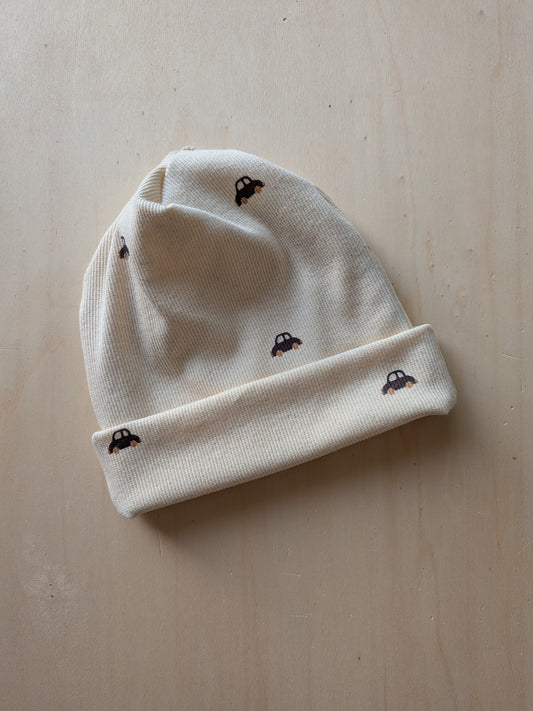 Beanie für Kinder – handgenäht aus weichem Rib-Stoff im Auto-Design